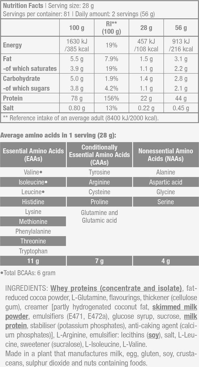 Instant whey proteins 84% { whey protein concentrate [emulsifier: lecithins], whey protein isolate [emulsifier: lecithins ( soy )]}, fat-reduced cocoa powder, L-Glutamine 4.6%, flavourings, thickener (cellulose gum), L-Arginine, salt, L-Leucine 0.2%, sweetener (sucralose), L -Isoleucine 0.1%, L-Valine 0.1%, bromelain powder 0.04%. Made in a plant that manufactures milk, eggs, soy, crustaceans, sulfur dioxide and nuts containing foods.
