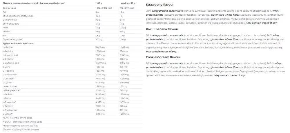 Μέγιστη αποτελεσματικότητα της προπόνησής σας με την τεχνολογία CFM, η οποία βοηθά τις πρωτεΐνες να διατηρούν όλα τα βιολογικά ενεργά συστατικά τους. Η βάση αυτού του προϊόντος αποτελείται από εξαιρετικά φιλτραρισμένο συμπυκνωμένο ορό γάλακτος (WPC) μαζί με την καθαρότερη μορφή απομονωμένης πρωτεΐνης ορού γάλακτος (WPI).