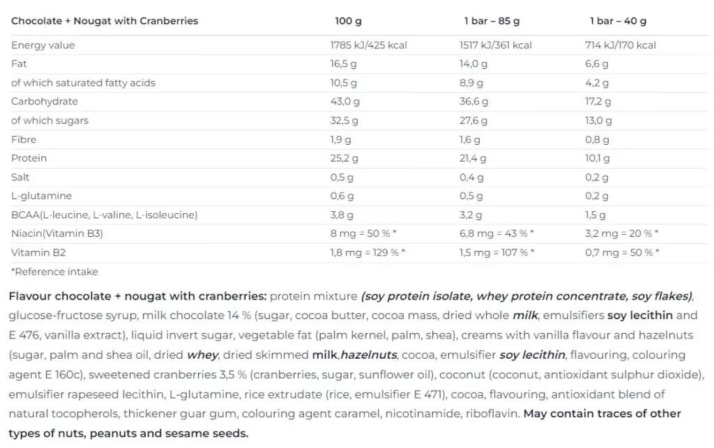 Διπλό στρώμα με σοκολάτα, νουγκά και cranberries, επικαλυμμένο με γάλακτος σοκολάτα ή γιαούρτι, προσφέρει έναν μοναδικό συνδυασμό γεύσης και ποιότητας. Είναι το ιδανικό σνακ για γρήγορη ενέργεια και ανάκαμψη μετά την προπόνηση ή σαν αντικατάσταση γεύματος σε πολυάσχολες μέρες.