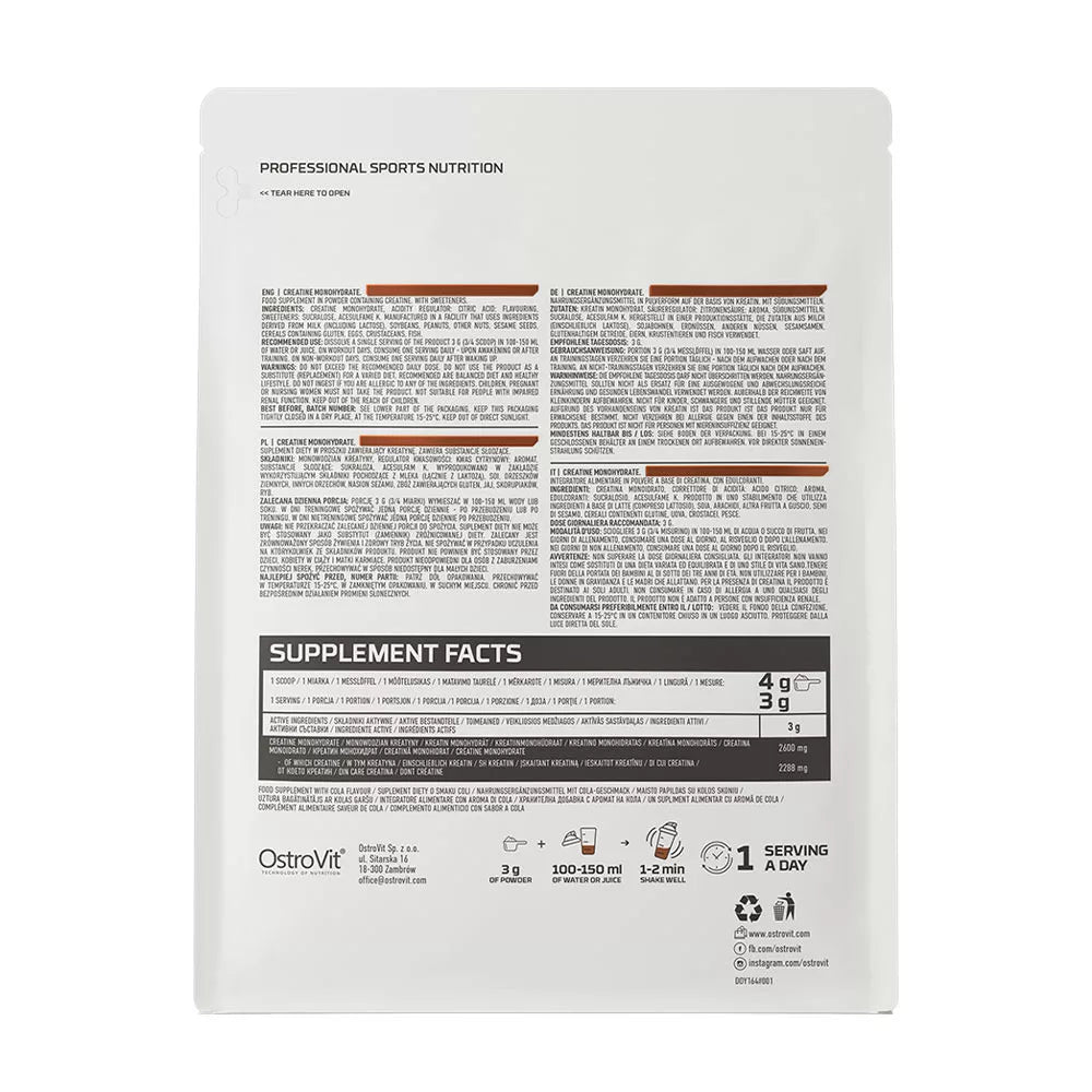Η OstroVit Creatine Monohydrate είναι συμπλήρωμα υψηλής ποιότητας με γεύση cola, που ενισχύει αποδεδειγμένα την αθλητική απόδοση, τη δύναμη και την αντοχή. Η κρεατίνη είναι οργανική ένωση που υπάρχει φυσικά στο σώμα και συντίθεται από αργινίνη, μεθειονίνη και γλυκίνη.
